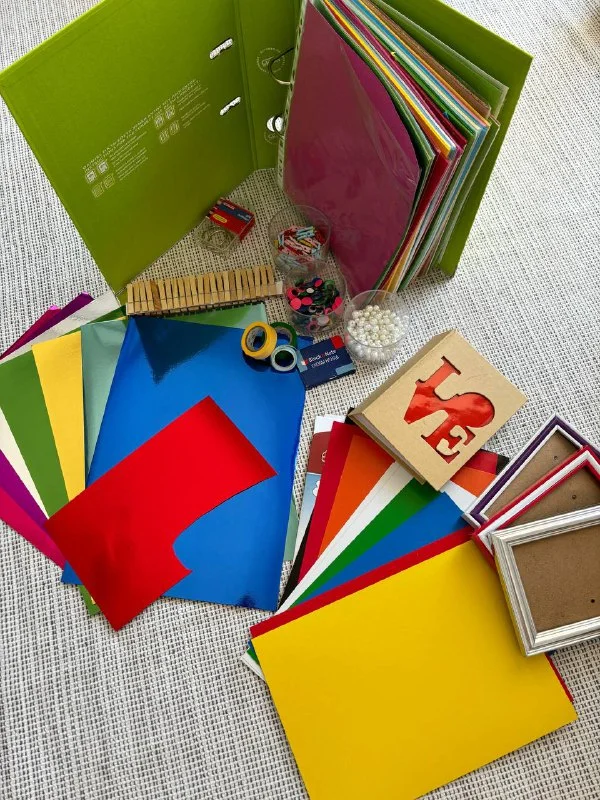 Большой набор канцелярии и рукоделия. Большая папка с разноцветной бумагой и картоном, Блестящий картон, альбом, рамки, бусины, разноцветные глаза, разные прищепки. За все 15 евро. Никосия
