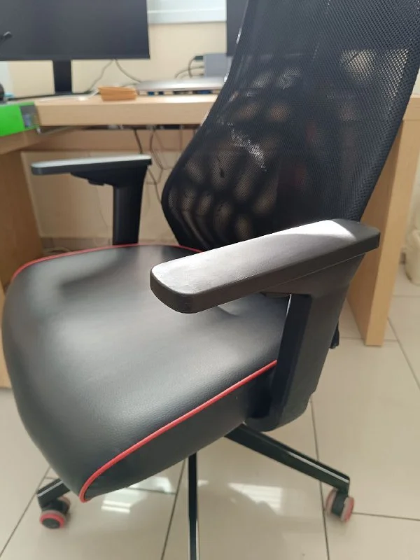 Примерно год было в использовании. Довольно комфортное для работы за компьютером: регулируется высота и качание. Без колёсиков и без подлокотников. Подлокотники можно докупить: 20 евро в магазине и по 10 на барахолке встречаются