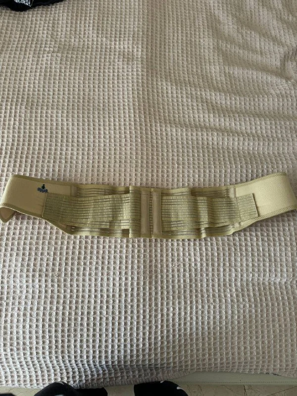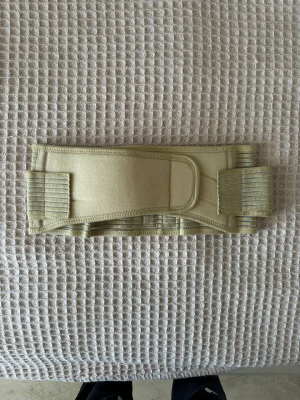 Бандаж для поддержания здоровья спины во время беременности и для живота после родов. Размер регулируемый, на липучке. По бокам есть дополнительные липучки для регулирования степени поддержки.