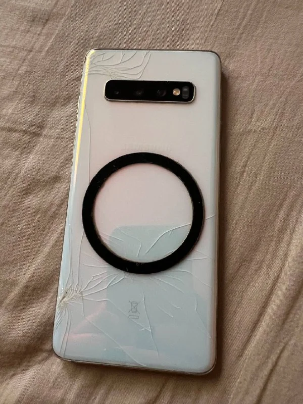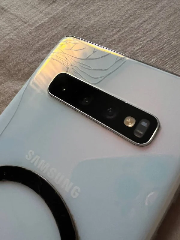 Samsung galaxy S10. Битая задняя крышка и нижний угол экрана скол. Ходила так очень долго под защитное плёнка и чехлом очень долго, ничего не сыпится. Телефон полностью рабочем состоянии.