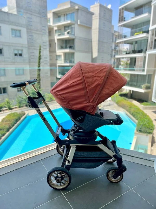 Коляска очень удобная и супер функциональная, блок вращается на 360 градусов, легкая алюминиевая рама, несколько уровней опуска козырька, что супер спасает на кипрском солнце. Очень маневренная.