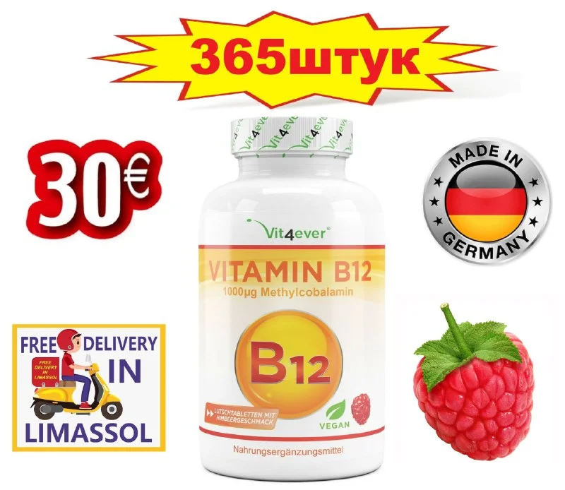 Витамин B12 💊 В банке:365 штук - на год ‼️ 🍓Малина 🍓 Веган 👍 Сделано в Германии 🇩🇪 Цена:€30. Бесплатная доставка по Лимасолу🚙