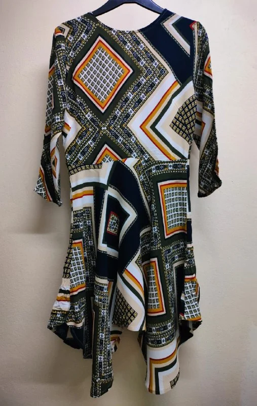• M&S Платье (с геометрическим узором). Это яркое платье с асимметричным подолом придаст вашему образу игривости и непринужденности. Размер: S, Длина: 100/85 см, Талия: 76 см, Ширина подола: 200 см, Рукав: 3/4, Материал: Слегка стрейч, без подкладки, Цена: 7 евро.
