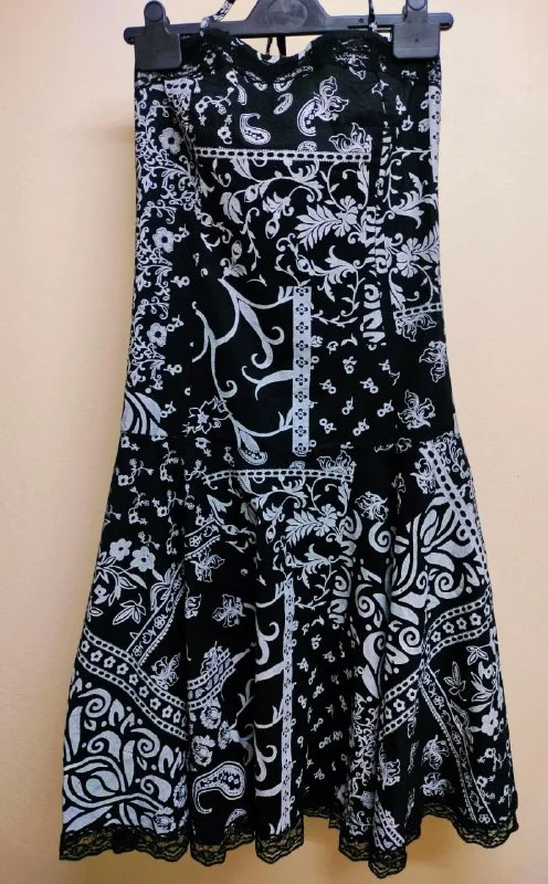 • Черно-белое трикотажное платье. Это элегантное платье обеспечивает максимальный комфорт, не стесняя ваших движений. Контрастный узор красиво подчеркивает лучшие черты вашей фигуры, умело скрывая все недостатки. Размер: S, Длина: 100 см, Талия: 72 см, Ширина подола: 120 см, Рукав: 3/4, Материал: Стретч, без подкладки, Цена: 3 евро.