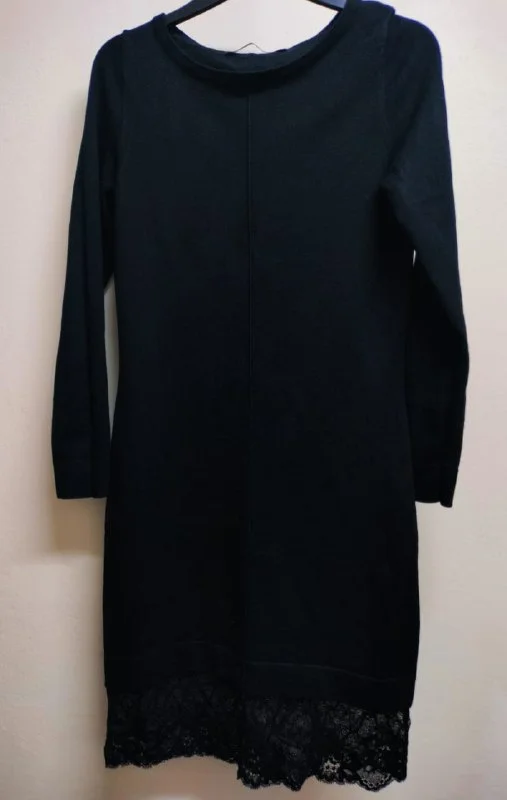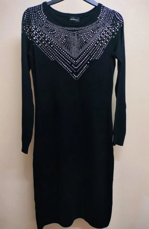 • Черное трикотажное платье. Это платье украшено элегантным узором из металлических страз. Идеально подходит для любого случая, когда вы хотите произвести стильное впечатление. Размер: S, Длина: 95 см, Талия: 70 см, Ширина подола: 88 см, Рукав: Длинный, Материал: Стретч, Цена: 5 евро.