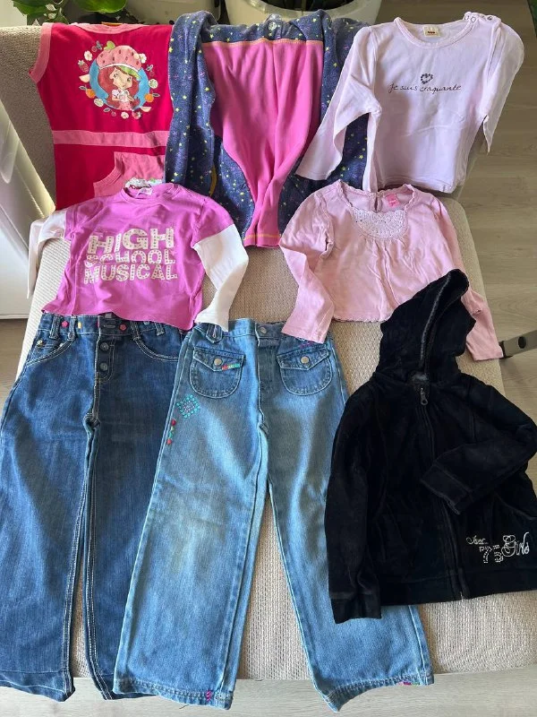 Джинсы, юбки, кофты, футболки, пижамы, куртки, платья, сарафаны и так далее. Выбор большой. Есть также бальные платья, шубка, карнавальные костюмы и тд