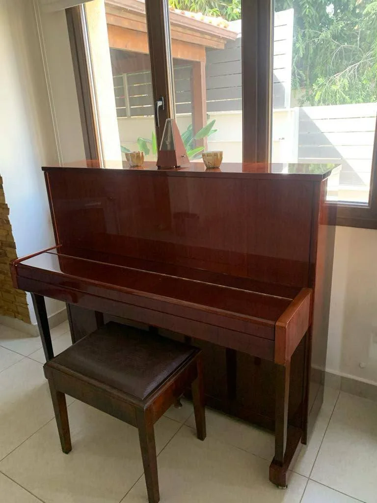 Preloved, modern Richter upright piano made by Pearl River. Beautiful warm tone, clear treble melodic register. Ideal starter instrument for those beginning their piano journey or transitioning from a keyboard, without a strain on finances.