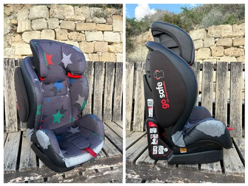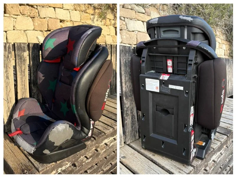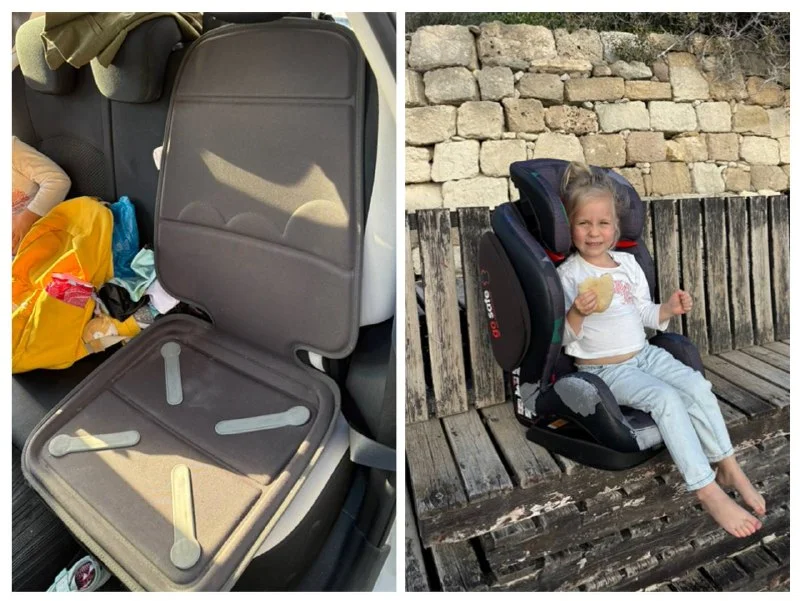 Детское автокресло. Пристегивается обычным ремнем. Судя по наклейке на кресле с таким типом пристегивания подходит для детей 15-36 кг. Наша 3,5 летка 16 кг отлично тут сидит. Купили здесь же под свой отпуск. Уезжаем 7го февраля, забрать можно 6го вечером (пока пользуемся). «Кожа» потерта, на функционал не влияет. Также в комплекте коврик под автокресло. Стоимость 25€ (можно рублями на рус карту).