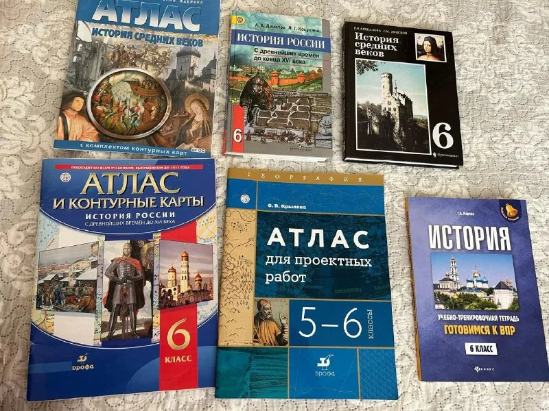 Продаю учебники за 6 класс.История средних веков и История России, атласы в подарок ( немного исписаны) за всё 10 евро, Пафос