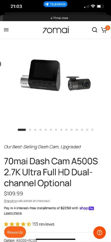 70mai A500S 2.7K Ultra Full HD, двухканальная запись (передняя и задняя камера)