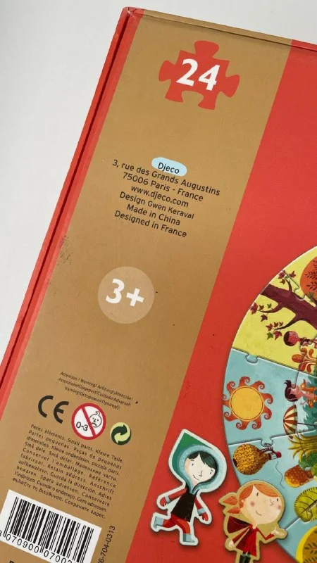 5€ Крупный паззл французского бренда Djeco "Времена года", возраст 3+ , 24 детальки, диаметр паззла в собранном виде 65 см (примечания: зимнего персонажа не хватает, персонажи немного "уставшие", на внутренней части крышки коробки нарисовано карандашами, в остальном в хорошем состоянии).
