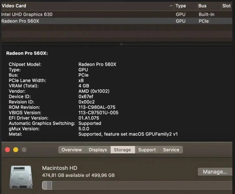 Intel Core i7, 512 SSD, 16GB RAM, Radeon Pro 560X.