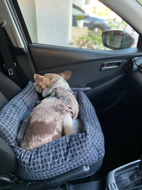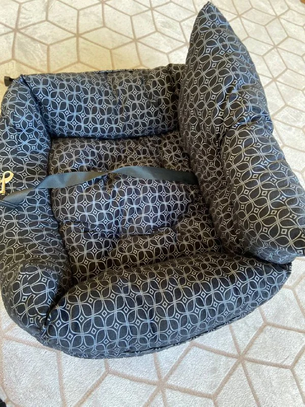 Автокресло для маленьких/средних собак. Пристегивается к креслу в машине, собака пристегивается за ремешок с карабином к автокреслу.