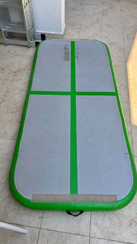 Размер: примерно 3х1 м. Прочный материал, отлично держит воздух. Подходит для гимнастики, йоги, игр. В комплекте мощный насос.