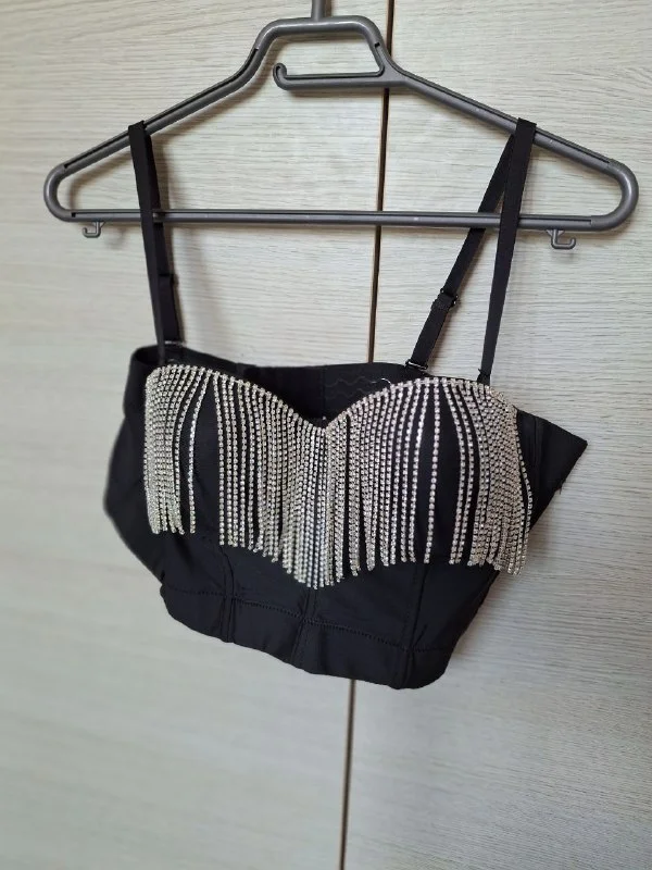 Девочки, продаю вечерний топ-корсет с чашками пушап, бретели регулируются по высоте, сзади широкая резинка с несколькими рядами крючков позволяет идеально подобрать ваш обхват. Размер L. Чёрный из плотного эластичного материала с блестящими подвесками 15€. Паралимни.