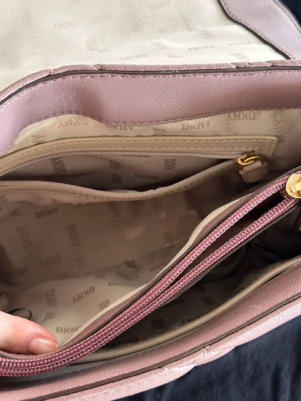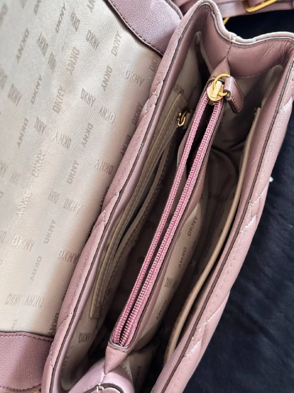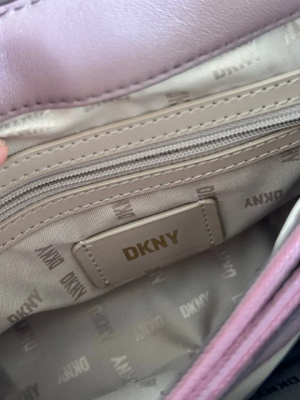 Оригинальная сумка DKNY Willow Quilted Shoulder Bag. Натуральная телячья кожа светло-фиолетового оттенка, стеганый дизайн, массивная цепь под золото, клапан на магните, внутри отделение с карманом на молнии.