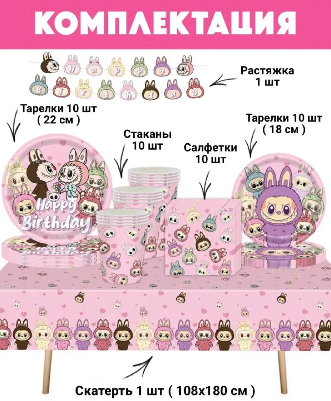 Новый не вскрытый набор одноразовой посуды для празднования дня рождения в стиле Лабубу (скатерть+стаканчики+тарелки+растяжка+салфетки+три шарика в разных цветах)