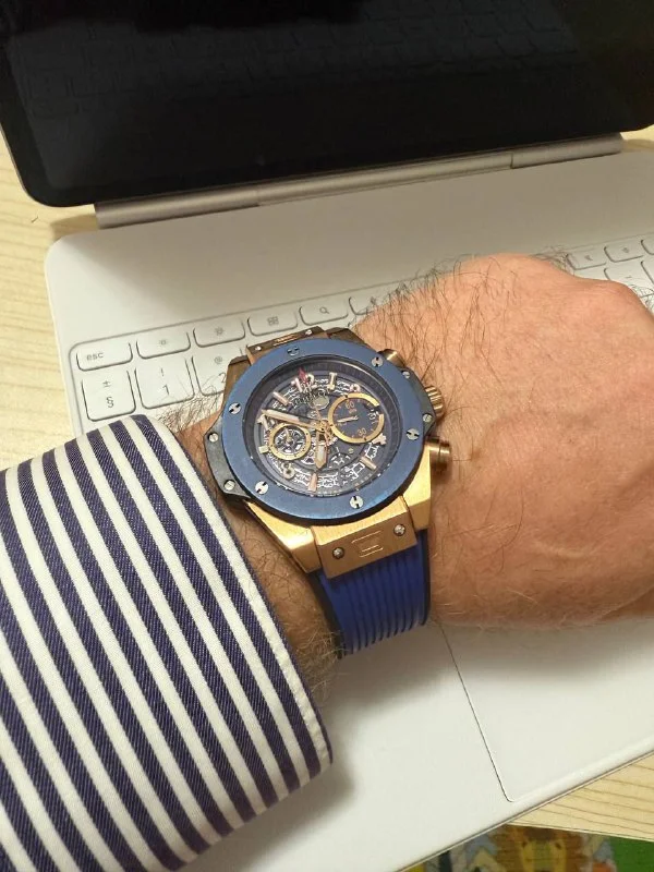 Продаются мужские часы Big Bang (носил 1 год), копия ААА+ в эффектном сочетании: корпус в золотом тоне, синий безель и ремешок, водонепроницаемые.