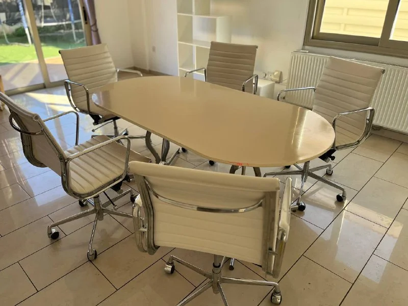 Овальный стол с дополнительной съемной стеклянной поверхностью и 5 стульев. Состояние кожзама б/у, все подъемные механизмы и колесики на стульях исправно работают. Стол 180х90 см.
