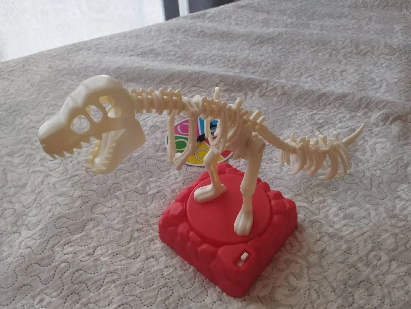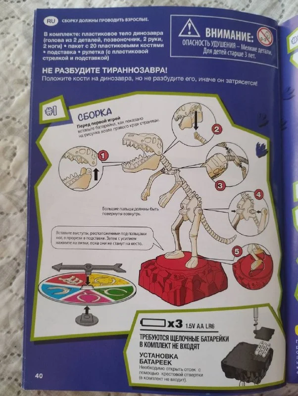 Не будите Ти-Рекса! В игре “Раскачивающийся Ти-Рекс” игроки по очереди размещают пластиковые кости на динозавре. Вращайте спиннер и поместите косточку, на которую он указывает, где-нибудь вдоль спины динозавра. Но будьте осторожны! Если игрок разбудит динозавра, тот встряхнется, и разбудивший его покинет игру. Выигрывает тот, кто выбывает последним! Если вашим детям нравятся динозавры, они непременно полюбят эту игру, и она станет отличным развлечением!