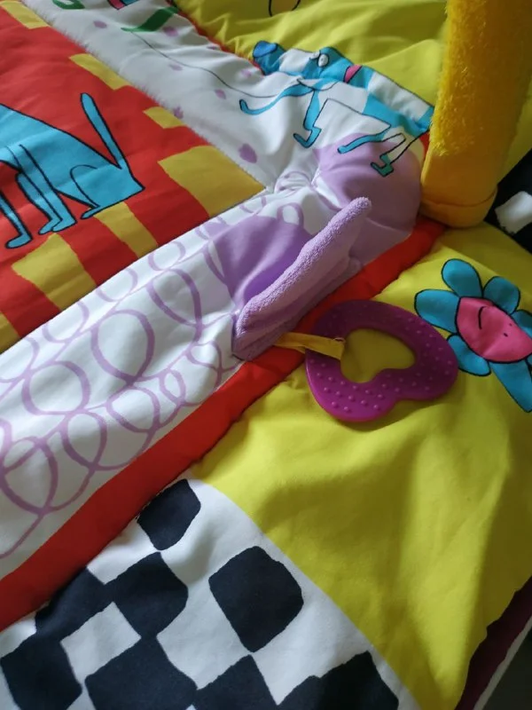 Разноцветная игровая поверность коврика выполнена из материалов разных текстур, для стимулирования тактильного восприятния ребенка. Есть грызунок, шуршащая поверхность, меховой треугольник, пищалка в цветочке.