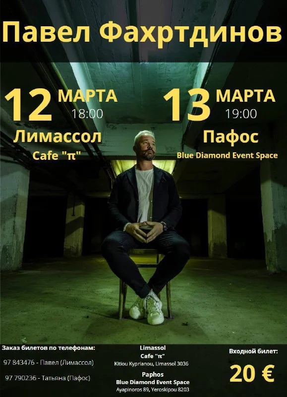 Ребят, к нам прилетает погостить Паша Фахртдинов, решили организовать ему концерт, а вышло сразу два (в Пафосе друзья тоже решили сделать). Приходите, он классный, из необардов 🤩 В следующее воскресенье в Лимасоле, и в понедельник в Пафосе