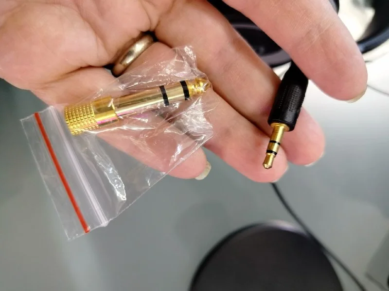 Взяли большие (рабочие) наушники, воткнули с переходником - звук есть в одном ухе.