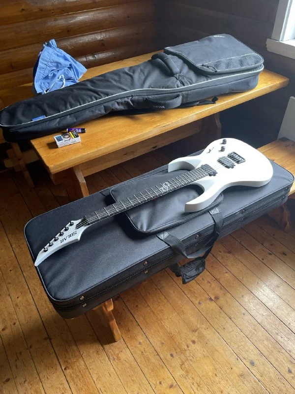 Нет струн, но сама гитара в отличном состоянии. В комплекте ремень, тюнер и стойка.