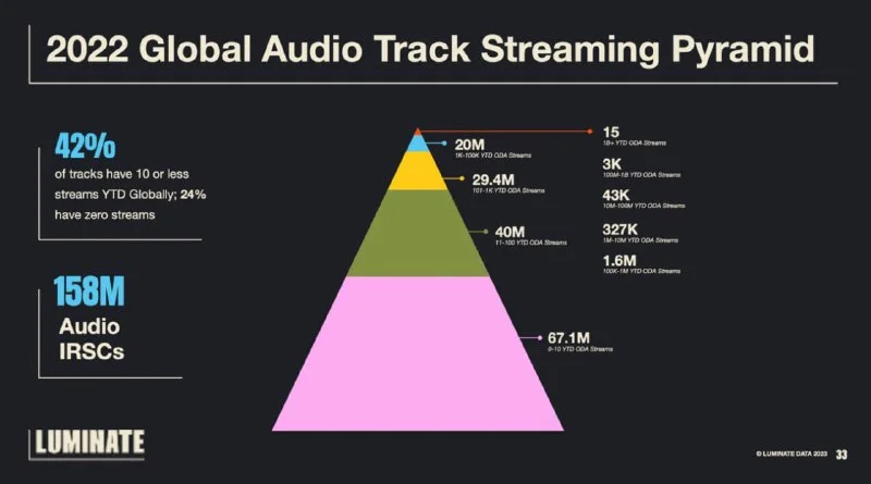 Вот вам немного мотивации утром в понедельник: 42% музыки на стримингах никто никогда не слушал (0-10 прослушиваний, учитывая что 10 послушал сам автор скорее всего).