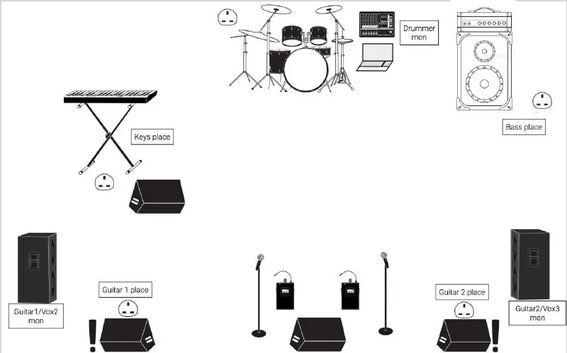 In the picture you can see the basic layout of the stage, below is a detail for each of the musicians: