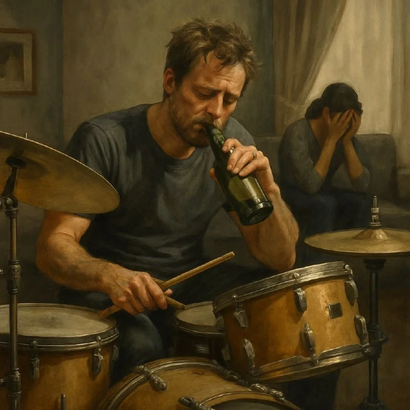 А красиво чат жпт рисует промпт пьющий барабанщик - горе в семье