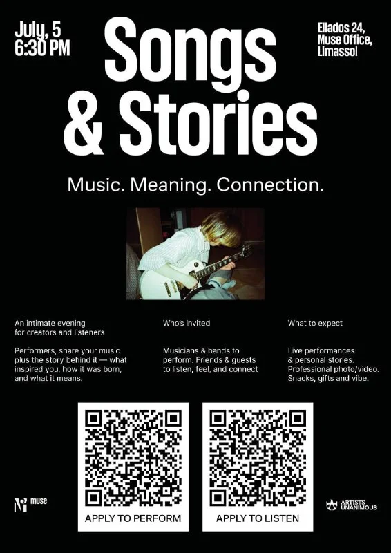 Остались последние слоты, чтобы выступить на уютной встрече Songs & Stories в офисе наших друзей Muse Group (behind the Ultimate Guitar) и сообщества Artists Unanimous.