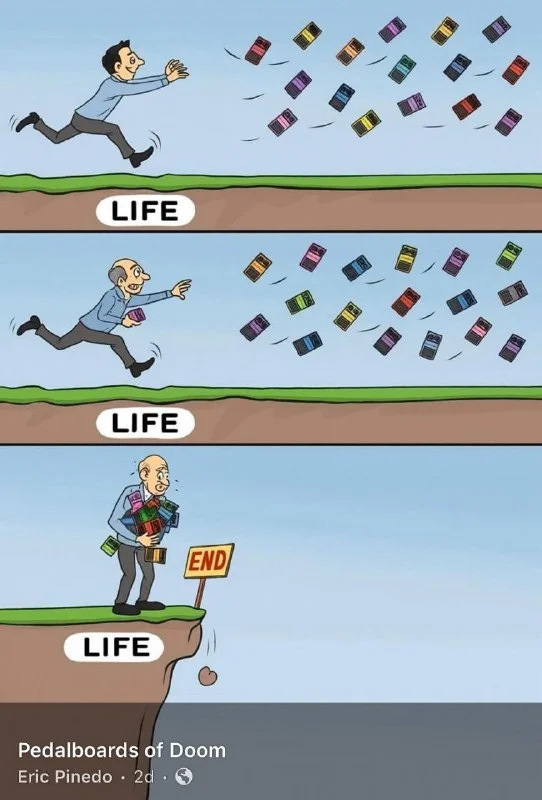 Картинка как будто что-то важное хочет донести, как будто жизнь слишком коротка, чтобы за всякими примочками бегать. Ну а в чём тогда её смысл, кроме как прочитать все книги, выучить все песни, пощупать все примочки, выпустить сингл?