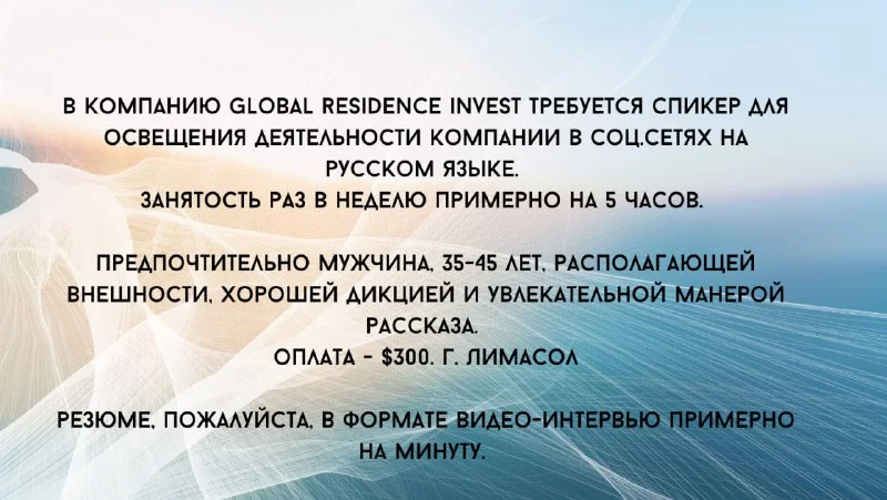 В русскоязычную компанию Global residence invest требуется спикер для освещения деятельности компании в соц.сетях.