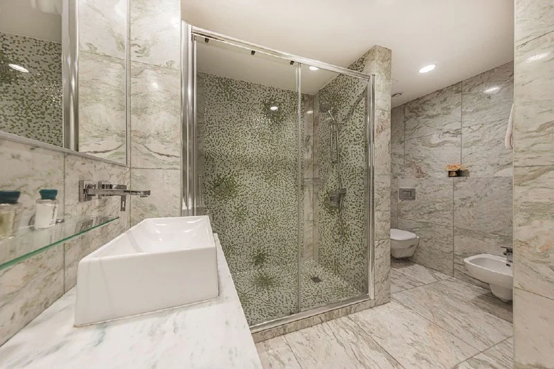 • Элегантная ванная комната с современной сантехникой и отделкой под натуральный камень