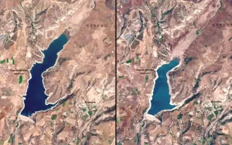 🛰️ Σημαντική πτώση της στάθμης του νερού στο φράγμα Ασπρόκρεμμου στην Κύπρο