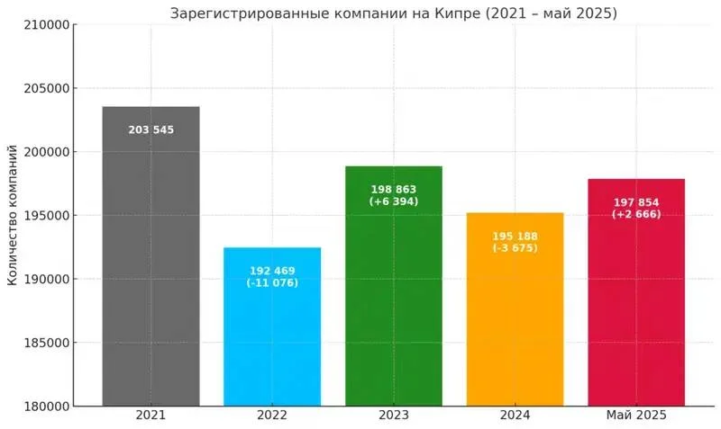 ▪️ Τον Μάιο του 2025, υπήρχαν 197.854 εγγεγραμμένες εταιρείες στην Κύπρο. Μετά από μια μείωση το 2024, η επιχειρηματική δραστηριότητα έχει αρχίσει να ανακάμπτει, αν και δεν φτάνει το επίπεδο του 2022.