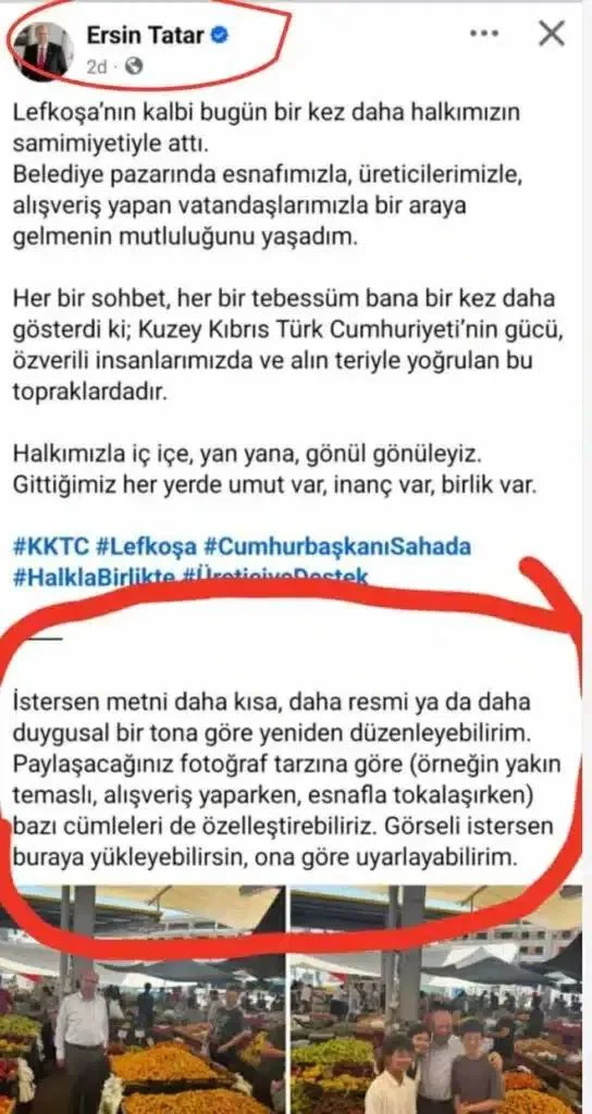 Ο ηγέτης του κατοχικού καθεστώτος, Ερσίν Τατάρ, έγινε «ήρωας» των κοινωνικών δικτύων μετά τη δημοσίευση μιας ανάρτησης σχετικά με μια επίσκεψη στην αγορά της Λευκωσίας, στην οποία παρέμεινε κατά λάθος μια φράση υπηρεσίας από το ChatGPT, η οποία λέει «Αν θέλετε, μπορώ να ξαναγράψω το κείμενο, κάνοντάς το πιο σύντομο, πιο επίσημο ή, αντίθετα, πιο συναισθηματικό».