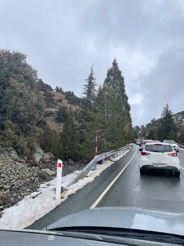 Сообщается, что на подъезде к Троодосу большая пробка, снегопада нет и +4 градуса.