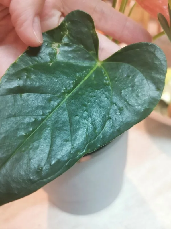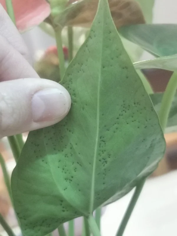 Земля не просыхает у него. Я ещё ни разу не поливала, только брызгала и уже чёрные точки пошли от повышенной влажности. Думала пересадка поможет просушить чуть. (это мой первый антуриум)