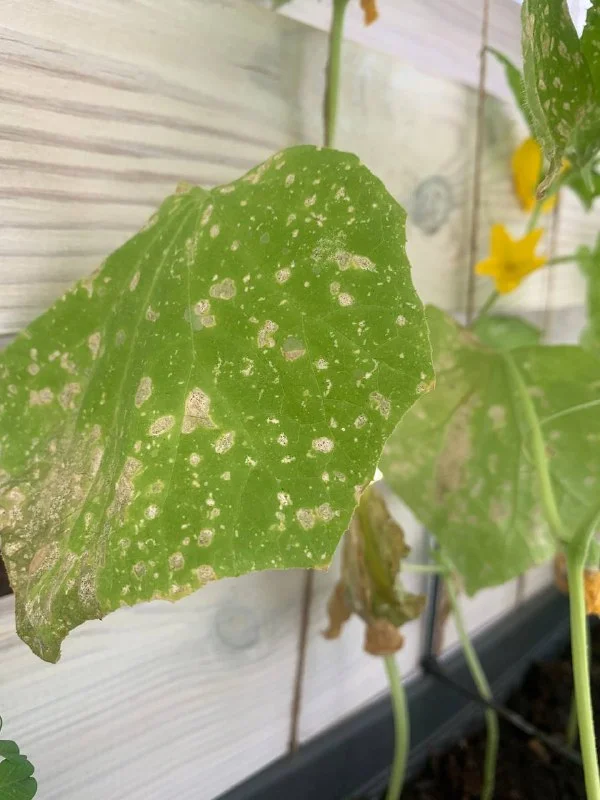 У меня например огурец пытаются на улице трипсы есть, причем массово. На старых листьях мелкие посеченности, как у вас на листе на заднем плане на этом фото. Новые чистые сначала, потом их тоже начинают подъедать. Но большие пятна уже вызывают вопросы у меня.