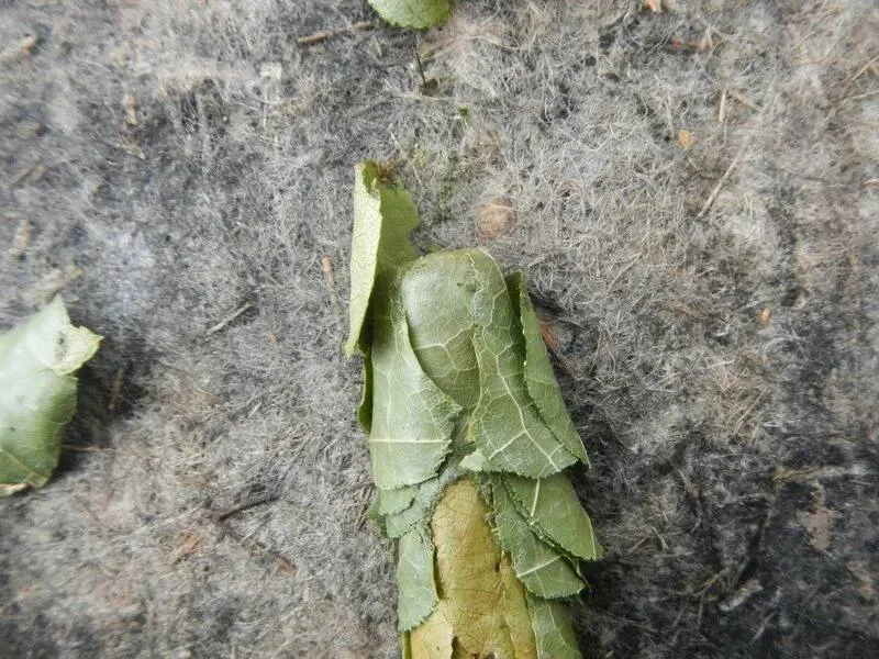 Очень похоже на срез саранчи или пчелы листореза. Они в такое время срезают для капсулы-гнезда листья нежных цветов для кладки, а после заворачивают в листья жестче.