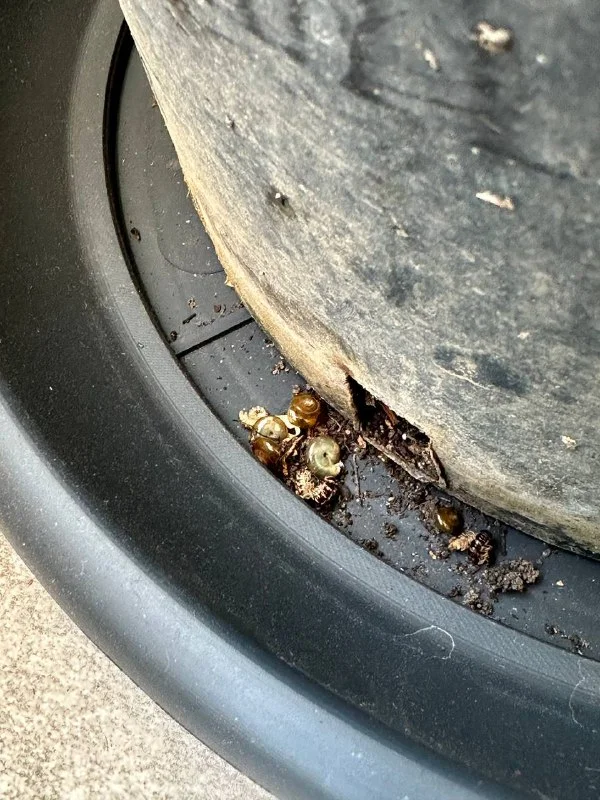 Хм кажется найдена причина грусти моего кумквата. Я его как привезла из кугардена, не пересаживала еще. Вот повернула сегодня горшок и там такое! Причем я поворачивала горшок постоянно и не было этих товарищей. Помершие от жары улитки)) Я их ни в самом горшке не вижу, ни на листьях. Посоветуйте, что лучше сделать? Я во-первых хочу пересадить (мне его земля не нравится. Я проверяю ее гигрометром и она всегда влажная не просыхает вообще даже в такую жару). Обрабатывать жестокой химией растение с плодами не хочется… поискала по чату - нашла совет с перлитом, после пересадки сделаю)