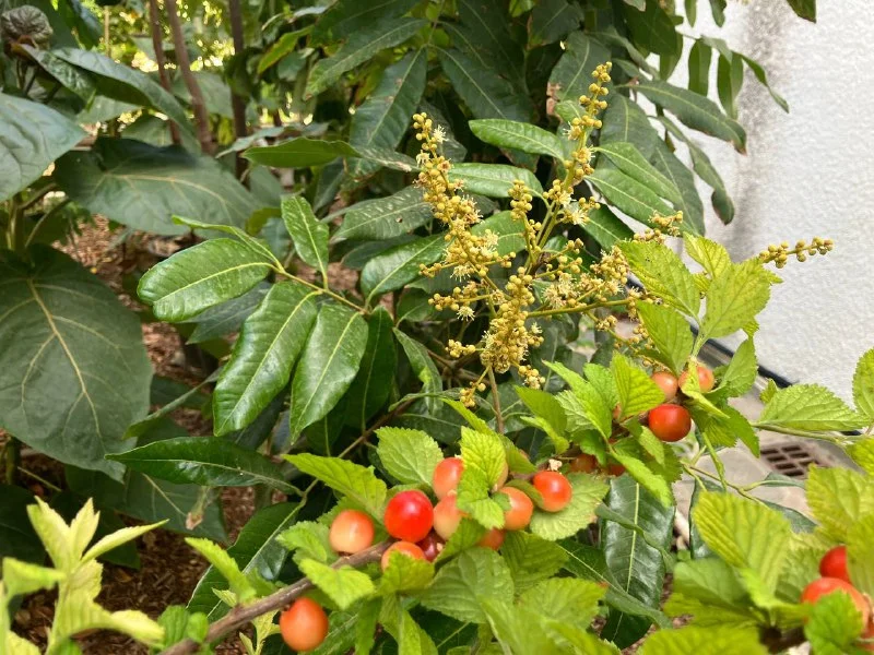Встреча старых фуцзяньских друзей на новом месте! Цветущий Dimocarpus longan и созревающая Prunus tomentosa. Китайский уголок в саду.