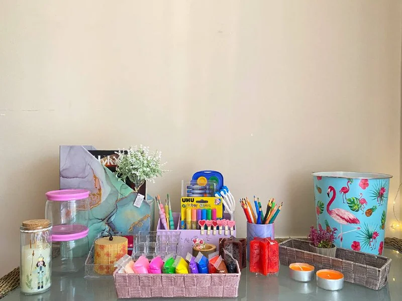 Кисти и краски для рисования, карандаши двух типов
