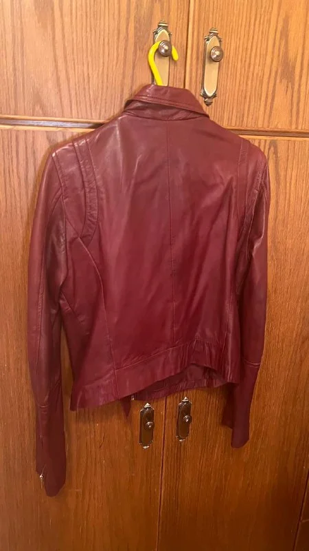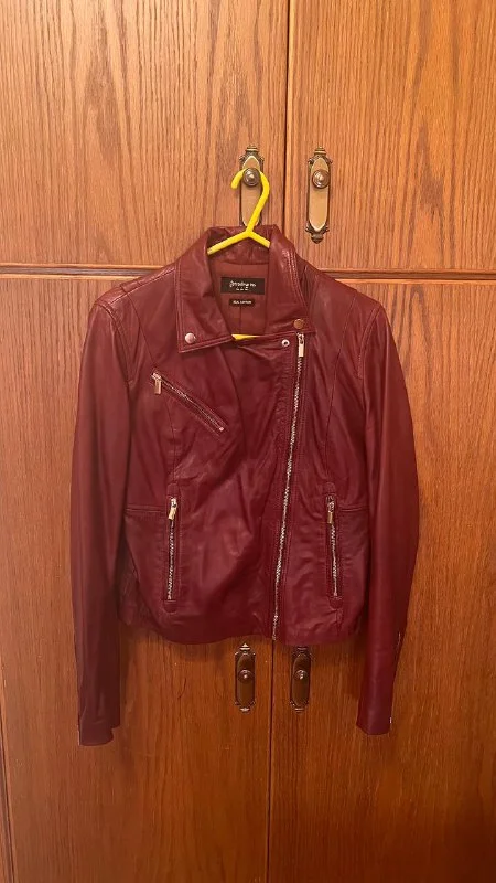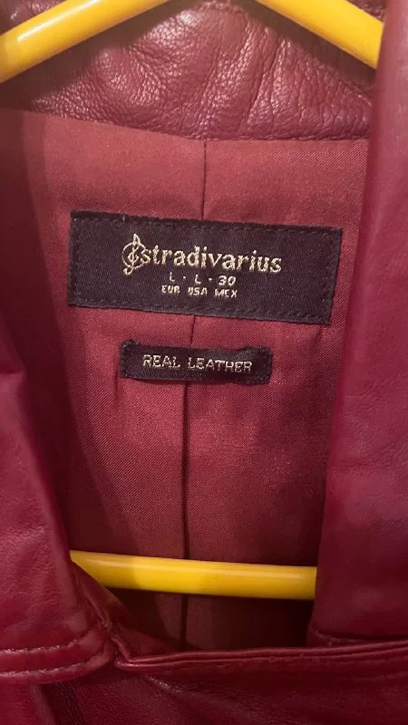 Куртка из натуральной кожи a Stradivarius, никогда не надевалась, в идеальном состоянии, потрясающего бордового цвета,размер L, €55. Лимассол.