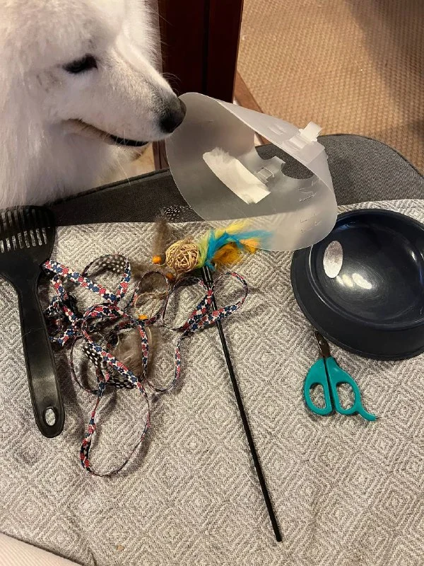 Разные мелочи для кота. Поводок, две игрушки, воротник, миска, лопатка для уборки туалете. Туалет тоже в комплекте. За все 5 евро