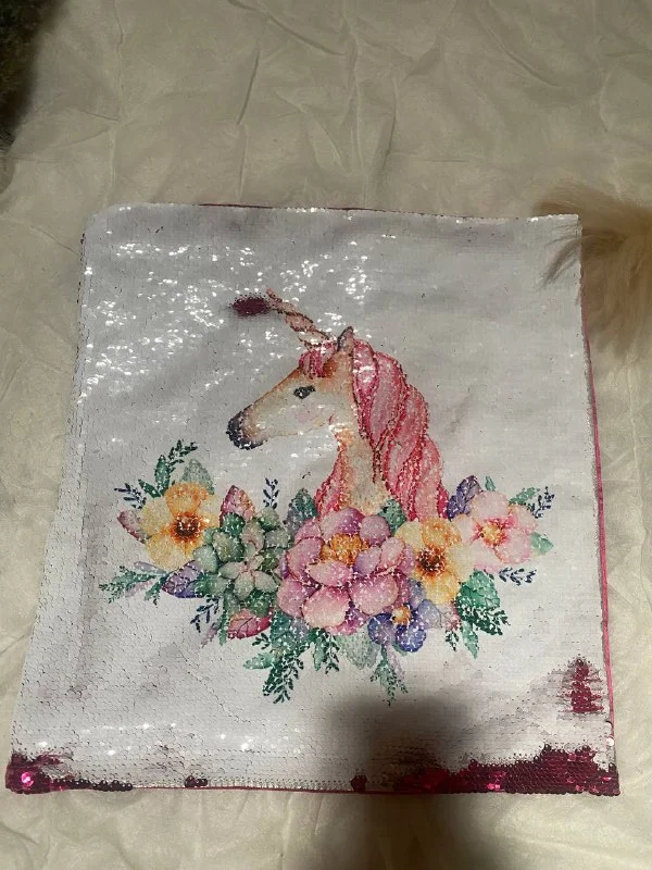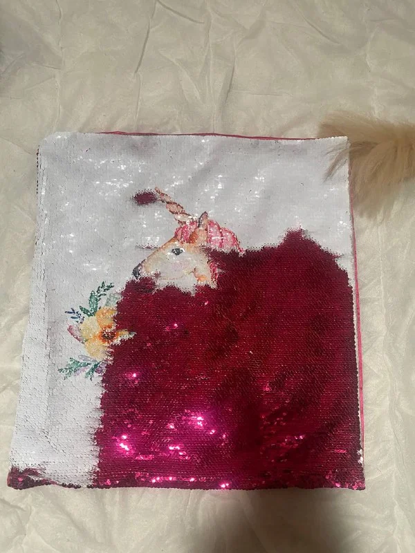 Фото 2-3 - наволочка новая, квадратная, небольшая, с единорожкой, или если пайетки прогладить в другую сторону - цвета фуксии