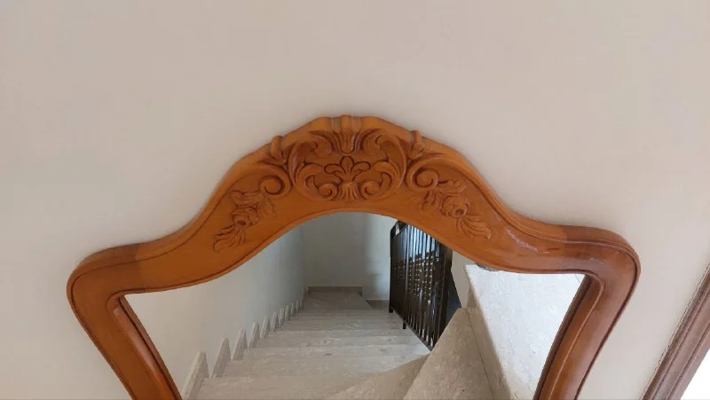 Зеркало, массив дерева с резным декором в верхней части.
