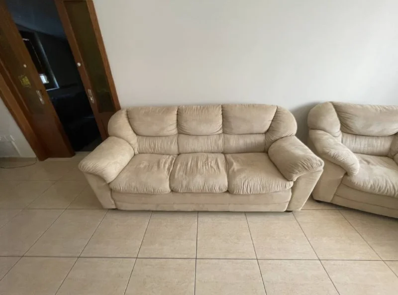 2 дивана и одно кресло, оба бежевого цвета, из мягкого материала, б/у, но в очень хорошем состоянии. 🛋️